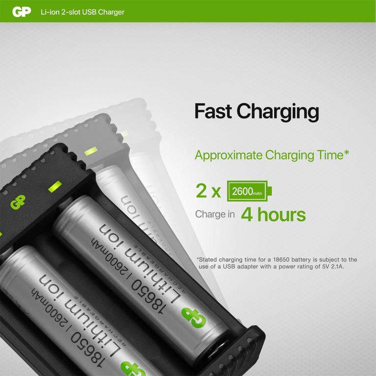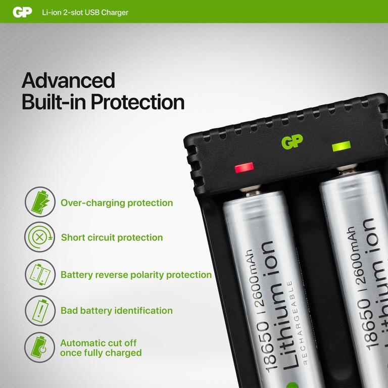 Keep your Li-ion rechargeable batteries powered up with GP’s flexible and powerful USB charger, which will charge 10440 to 26650 batteries. Intelligent Charging Speed Optimisation ensures your battery is optimally charged regardless of size, while Advanced Built-in Protections and Automatic Cut-off, keep your devices safely powered up when you need it.