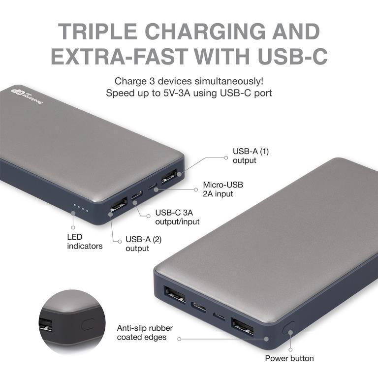 USB-A x 2 DC 5V at 2.4Ah , USB-C 5V at 3Ah, Total Output 5V at 3Ah