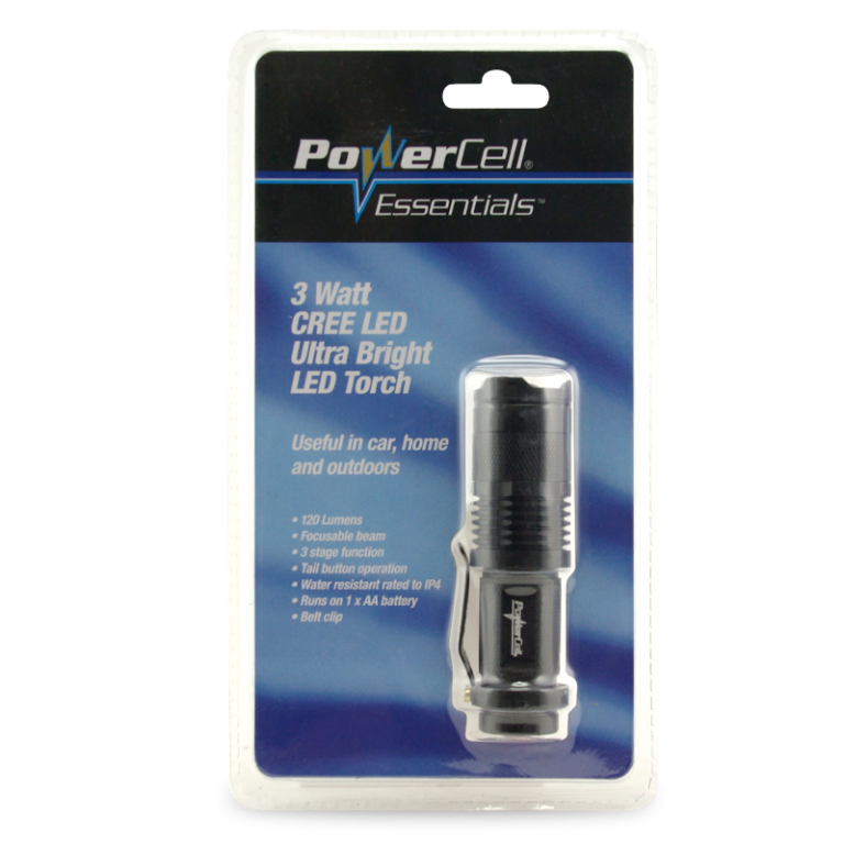 Powercells compact and convenient torch. Provides 120lm LED, 3 function light settings (high, low and flashing) as well as focusable and adjustable beam. UP to 4 hours runtime. Accessory packed with lanyard and belt clip, it is perfect for the purse, glovebox or backback.